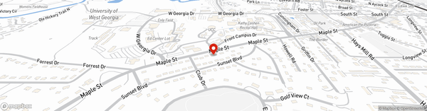 White brick building across from UWG's main entrance main entrance- look for the flags!